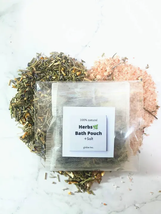 贅沢なリラックスタイムを演出する Herbs & Salt Bath Pouch 無農薬で育てられた7種類のハーブが贅沢にブレンド♪ Herbs Bath Pouchは、浴槽を美容成分で満たし、心地よい香りでリラックスできます。ローズマリーやラベンダーなどのハーブの恵みがお肌に美しさと若々しさをもたらし、1度目の使用から違いを実感! 香り高いローズマリーや優しいラベンダーが心を落ち着かせ、ストレスを吹き飛ばします。 ホーリーバジルやレモングラスによる爽やかな香りは、心身をリフレッシュ♪ タイムやくちなしの実、ゆずの柑橘類の香りは、明るい気分をもたらし、日々の疲れを癒す効果があります。 そして、贅沢にもヒマラヤから採掘された自然そのままの岩塩をブレンドしました。 温泉効果で体の芯からポカポカです。 疲れた体を癒し、心をリフレッシュさせる上質な入浴体験を提供します。 バスタイムにリラックスや美容ケアを求める方におすすめのアイテムです。 忙しい日常や疲れた心身を癒しながら、美しさを引き出す贅沢な時間を...。 【数量】 10パック入り (ハーブ7g ソルト20g) 【使用ハーブ,ソルト】 ローズマリー, ラベンダー, ホーリーバジル, レモングラス, タイム, くちなしの実, ゆず等(柑橘類) ヒマラヤ岩塩ピンク(パキスタン産)