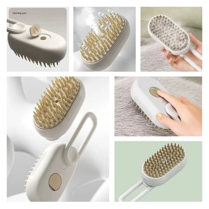 【ペット専用スチームブラシ】 スチーム技術を搭載したこのブラシは、ペットの毛に付着したほこりや汚れを効果的に除去し、清潔でフレッシュな状態を保ちます。スチーム機能が静電気を防ぎ、抜け毛が散らばるのを抑えます。 噴霧量:1.68ml/分、タンク容量:20ml。 【犬猫短毛~長毛に対応】 このスチームブラシは、短毛から長毛まで、あらゆる種類の犬や猫に対応します。トリートメントやマッサージ、抜け毛除去、シャワー後のケアなど、さまざまなシーンで活躍する多用途なブラシです。特に換毛期に毎日使用することで、服や部屋に散らばる抜け毛を大幅に減らせます。 【3つの機能で徹底ケア】 糸くず取り、クリーニング、マッサージの3つの機能を1つに集約した多機能ブラシです。丸い歯がペットの毛から汚れや抜け毛、もつれをしっかり取り除き、美しい毛並みに整えます。 【高品質ABS素材採用】 耐久性に優れた高品質のABS素材を使用しており、ブラシの歯は先端が丸く加工されているため、ペットの皮膚を傷つける心配がありません。初心者の方でも安心して使用できます。 【USB充電式・長時間使用可能】 USB充電式で繰り返し使用できるペットブラシです。内蔵の150mAhバッテリーにより、一度の充電で約60分間使用できます。 充電はUSBポート付きのパソコンやモバイルバッテリー、ACコンセントに対応。フル充電時間は約30分です。バッテリーは噴霧機能にのみ使用され、ブラッシングは手動で行います。 【360度回転ハンドルで快適グルーミング】 ハンドルは360度回転可能で、あらゆる角度から快適にグルーミングが行えます。使いやすく、手入れも簡単です。*ハンドルは細長く、フックに掛けて保管することができます。ブラッシングの際は、必ず本体を使用してください。