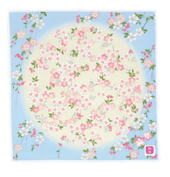 友禅刺繍 ハンカチ「京友禅」は、江戸時代より町人文化と共に受け継がれ、近代では様々な染色技法による表現が見られ、日本における模様染めの代名詞として使われるほど、世界的にもよく知られています。 淡い色彩で柄を切り替えることで、豊かで雅な情緒を表現し、その上に写実的な紋様をあしらいました。ハンカチの右下にワンポイントの刺繍を施した、日本の美しいハンカチです。 ハンカチに使用した「綿ローン素材」は、薄手でさらっと軽やかな平織の生地。肌触りがよく、高級感がある素材です。 夢見桜(ゆめみざくら)日本の国花である「桜」の柄をハンカチ一面に描き、まるで万華鏡の中を覗いているかのような、夢見心地な優しい図案のハンカチです。