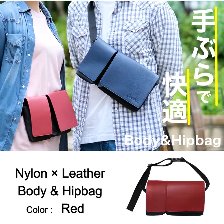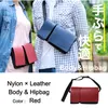 ナイロン×牛革ボディ&ヒップバッグ Red