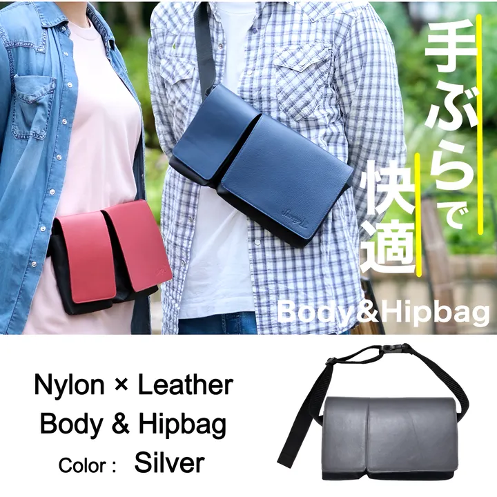 ナイロン×牛革ボディ&ヒップバッグ Silver