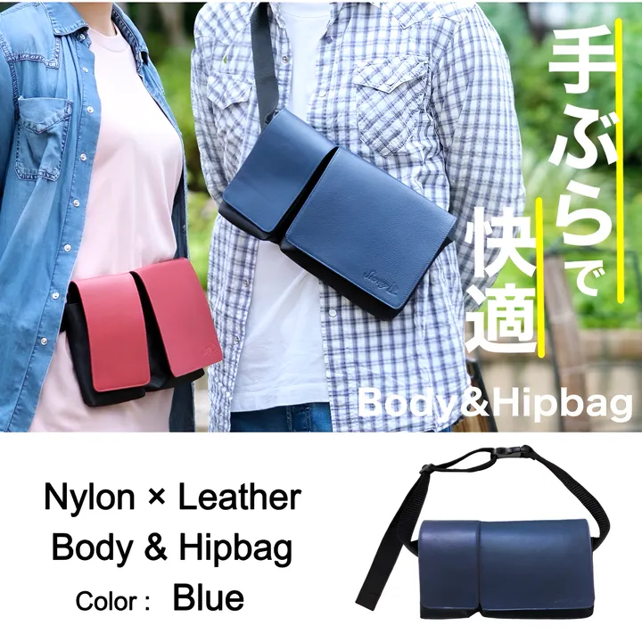 ナイロン×牛革ボディ&ヒップバッグ Blue