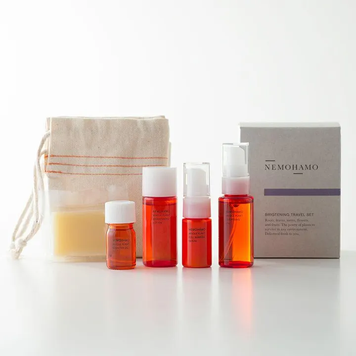植物由来の美容成分をたっぷり含んだ、クレンジングオイル・洗顔ソープ・ブースターオイル・ブライトニングローション・フルバリア美容液のトータルスキンケア5点セット。オタネニンジンをはじめ、ビタミンやミネラルを豊富に含んだ植物エキスが、弾むようなハリと透明感あふれる澄んだ肌へと導きます。 〇フルラインをミニサイズで10日間分のスキンケア5点セット 旅行用にもお試し用にも使えるミニセット。マイルドな使い心地の「クレンジングオイル」に、コールドプロセス製法でじっくり熟成させた「洗顔ソープ」。ローションの浸透※をサポートする「ブースターオイル」に、透明感のある肌へと導く「ブライトニングローション」、そして最後に潤いをしっかり閉じ込める「フルバリア美容液」の5点セットをご用意しました。 石油由来の原料を一切使用せず、植物をまるごと低温真空抽出法で丁寧にエキス化。ビタミン・ミネラルなどを含んだ良質な植物エキスが、ツヤやかで澄んだ肌へと導きます。 ※角質層まで 〇NEMOHAMO特製の巾着袋付き 持ち運びに便利なNEMOHAMOオリジナルの巾着袋が付いています。旅行や出張などの外泊時にも、スキンケア用品を1つにまとめて携帯できるので便利です。コットン100%の生地を使用しています。 〇こんな方におすすめ ・旅行用やお試しで使いたい ・乾燥が気になる ・キメの乱れが気になる 〇キー成分 ・オタネニンジン 日本では和漢として広く知られ、古くから重宝されているオタネニンジン。 対馬で農薬不使用で育てられた3年もののオタネニンジンの、ひげ根も葉も茎も花も、あますところなくエキス化しました。ハリ/ツヤ/整肌/保湿など、肌にうれしい効果が凝縮されています。 〇配合しない成分 石油由来合成香料、石油由来合成着色料、石油由来合成防腐剤、シリコン、鉱物油、石油由来合成界面活性剤 〇ブースターオイルの使用上のポイント 最後の一滴までフレッシュなオイルを清潔に使っていただきたいため、オイルキャップに空気弁を設けています。容器を逆さまの状態で静置すると、弁(空気穴)から空気が通り、ゆっくりと中身が出てきます。