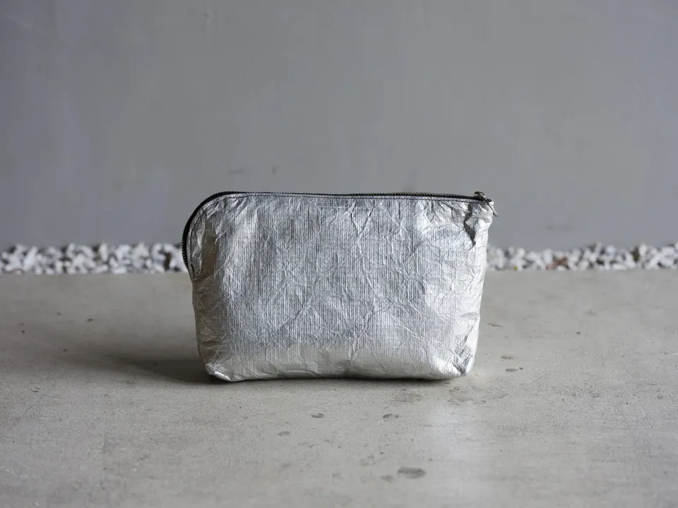 マスクの収納、小物入れとしても活躍するポーチ。 裏地に抗菌・抗ウイルス機能繊維加工技術クレンゼ®︎で固定化抗菌成分Etak®︎を繊維表面に固定化して加工した抗菌生地を使用。繊維状態の細菌を抑制し、マスクを清潔な環境で保管できます。 ■ 表地:タイベックシルバー タイベック生地は、高密度ポリエチレン100%の強靭で耐久性のある不織布です。 軽く、水に強く、強度もあり、なおかつ通気性とユニークな特性がたくさんある生地。薄手でしなやかな質感とともに、インパクトのあるシルバーカラーでおしゃれな上にバッグの中でも迷子になりにくいのがポイント。 ■裏地:抗菌素材 ・抗ウイルス機能繊維加工技術クレンゼ®︎を採用。 ・50回洗濯しても繊維上の特定のウイルスの数を99%以上減少。 ・ニオイの原因となる繊維上のモラクセラ菌や黄色ブドウ球菌などに対する細菌の増殖を抑制します。 ■仕様 ・ゴールド色のファスナーにすることでシンプルかつスタイリッシュなデザインに。 ・引き手のリング部分にお好みのリボンやキーホルダーをつけても。 ・中身の出し入れがスムーズに、ファスナーの端をラウンド仕上げ。 ・内ポケットは使用済みのマスク入れに。仕切りにカラーのパイピングを施しました。 ・マチがあるので立体的で収納しやすい。