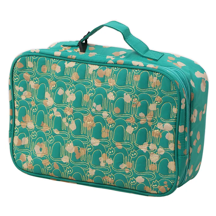 愛嬌のある猫を刺繍したシリーズ。 鮮やかな生地色と斑柄プリントとのバランスが絶妙です。 愛らしいピンク・爽やかなグリーン・上品なネイビーの3色展開で、あなたのトランクケースの中を彩ります! シューズケースは旅先でも足元までおしゃれを楽しみたいあなたの味方。 メッシュポケットにはスリッパやサンダルなど薄いシューズがすっきり収まります♪