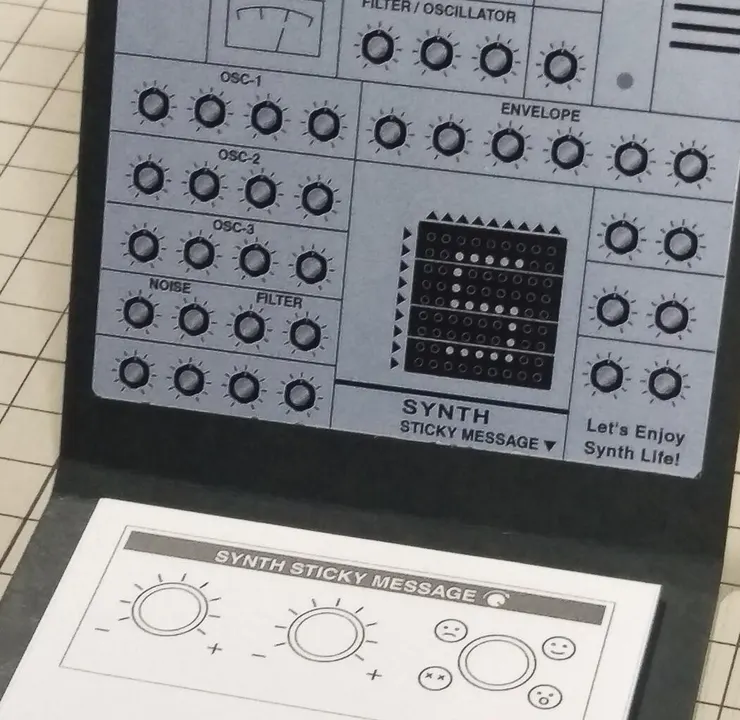 Synth Sticky A は シンセサイザーデザインの付箋です。 アナログシンセの名機 をイメージしました! アタッシュケース風カバーに、メタリックシルバーパネルシールを貼り合わせ上品に仕上げました。 付箋部はツマミをデザインしたSynth Sticky Message(SSM)を搭載。 項目を記入してツマミに線を加え、フェイスアイコンをセレクトすれば強力なメッセージ付箋が完成します! クリエイティブメモや、ちょっとしたお礼に。 メカニカルなツマミとメッセージにトキメクこと間違いなし。 サンプルセッティング(使用例)シートもついています。 アイデア次第で色々な使い方ができるシンセサイザー形付箋です。 〈Synth Sticky A 商品内容〉 本体(Synth Sticky A) 付箋(SSM)20枚 説明書(サンプルセッティングシート付き)