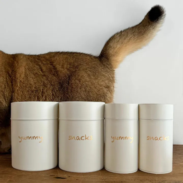 加藤製作所×POPPYS HOUSE ______________ 商品名 |ブリキ製オリジナルおやつ缶全種セット 内容  |Sサイズ『yummy』 / Sサイズ『snacks』 / Lサイズ『yummy』 / Lサイズ『snacks』 素材  |ブリキ板 内容量 |115g(S)172g(L) サイズ |W72mm × H152mm(S)       W111mm × H155mm(L) カラー |コットンホワイト×ゴールド 生産国 |日本 商品詳細 ━━━━━━ 明治28年創業、120年以上の歴史を持つ老舗茶筒メーカー『加藤製作所』とPOPPYS HOUSEがコラボしたブリキ製オリジナルおやつ缶が登場。 ナチュラルなコットンホワイトに上品なゴールドを纏った癒しモダンなデザイン。 昔ながらの製法で造ったブリキ製オリジナル缶は、一つ一つ職人による手作業で製造してるからこその温かみを感じられる仕上がりになっております。 ブリキ製の中蓋は製造できる職人の減少により、現在日本では2〜3社程度しか製造しておりません。 そんな中蓋付きのSサイズ缶は密閉度も高く、愛犬愛猫のチュールやおやつ、ジャーキーを保管したり、ご自身のお菓子やおつまみ、グラノーラ、パスタ、プロテイン、コーヒー豆、茶葉などの食品を保管するのに大変適しております。 Lサイズは大容量かつ手つきの蓋なので簡単に開け閉めする事ができるので、上記の食品はもちろんのこと、愛犬愛猫のドライフードを入れるのにとても適したブリキ缶となっております。 またSサイズLサイズともに、食品以外にもカトラリー、文房具、日用品を入れるなど、お好きな用途でお使い頂けます。 デザイン、クオリティー、機能性、使い勝手の良さ、全て兼ね備えたブリキ製オリジナルおやつ缶。 日本製の品質の良さ、手作りの温かさをぜひお確かめ下さい。 きっとお気に召して頂けるはずです。 お取り扱い ━━━━━━ ・水分がつくと錆びる恐れがありますので水洗いはしないで下さい。 使い始めは缶の内部を乾いた布で優しく拭いて下さい。 汚れた場合は水分をしっかり絞った布でふき取り、水分が残らないよう蓋をせずによく乾燥させてからお使い下さい。 ・水分を多く含む食品や塩分の多い食品は錆の原因になりますので、保存に適しません。 おつまみ類で塩分の多い食品は直接缶に接触しないよう、ビニール袋等何かに包んだ状態で保存して下さい。 ・完全密封容器ではありませんので、湿気を嫌うものを入れる場合は乾燥剤を入れてご使用下さい。 ・粘着性の高い市販のシール、テープを缶に貼ると、塗料が剥げてしまう恐れがありますのでご注意下さい。 備考 ━━━━━━ ・製品の材料であるブリキは現在食品用の缶詰に利用されているものと同一の素材ですので、食品保存上健康に問題ありません。 ・外蓋と中蓋が二重で湿気をさえぎり光を遮断する構造により、食品を長持ちさせることが可能となっております。 ・缶の蓋にわずかな凹みが生じていることがございますが、缶に塗装を施した後、キリのような道具を使いろくろから缶を移動した際の跡です。 不良ではございませんので、ご了承下さいますようお願い致します。 寄付について ━━━━━━ どんな小さな声も聞き逃さない。 世界中の助けを求めている全ての動物を救えるように売上の10%を寄付してます(˘ᵕ˘ )♡