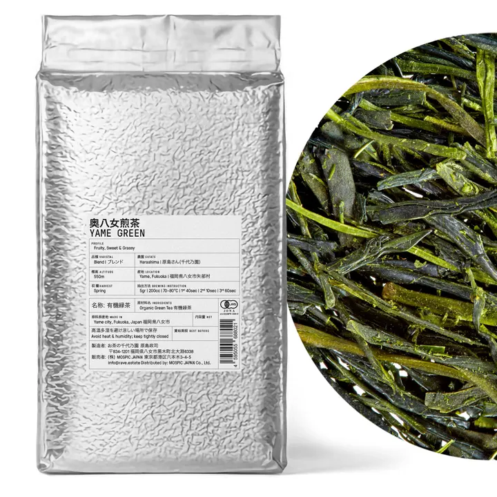 銘茶の里・八女。その中でも最も標高が高い矢部村の茶畑で無農薬・無化学肥料で育てられた茶葉100%使用の春の一番茶。 山林に囲まれた標高500-650mの畑ではよく霧が立ち、その霧がもたらす適度な日光の遮断は茶葉の香りと甘みを増大させます。 やぶきたとおくみどりベースのブレンドで香り・甘み・旨みのバランスが秀逸です。 少し冷ましたお湯で淹れたら爽やかな香りが立ち上り、目覚めの一杯にも、食中・食後の一杯にもぴったりなお茶の出来上がりです。 常温の水と茶葉を100:1で合わせて冷蔵庫にしまえば、8時間後には完璧な水出し茶が仕上がります。冷蔵庫での抽出だと苦味(カフェイン)や渋み(タンニン)の成分が抽出されないので、お茶本来の上品な甘さとエレガントな香りを楽しめます。 こちらの茶葉は有機JAS認証取得済みです。 茶葉使用量の目安 水出しの場合は常温の水1Lに対して茶葉10g使用。冷蔵庫で8-12時間抽出。 お湯の場合は200mlの急須に茶葉3-5g、3-4煎の抽出が可能です。