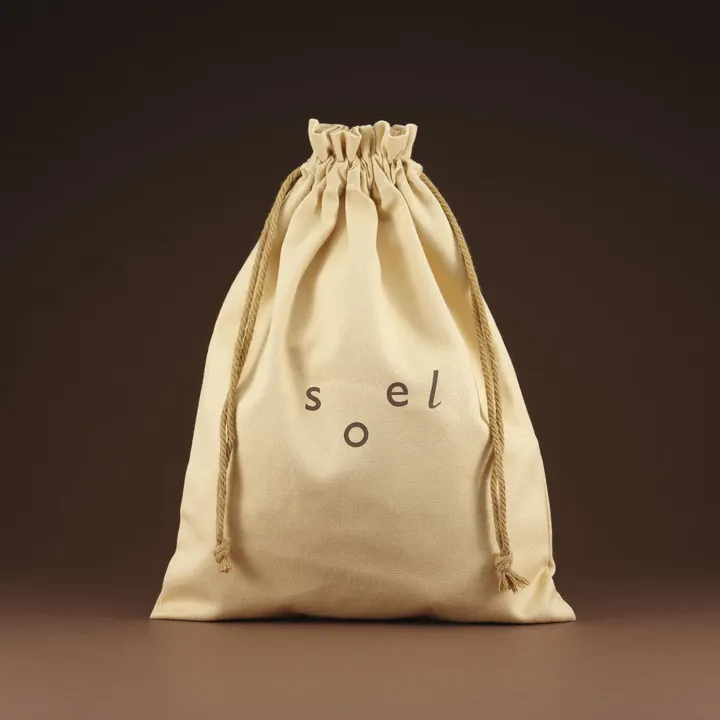 ギフトや、ご自宅用へ。soelロゴ入り巾着 使いやすい大きさのきなりの巾着にホワイトでsoelロゴをあしらいました。 ギフトラッピング用はもちろん、 日々の生活の中でも大切なものを入れて頂いたり、バックの中の整理に使用したりと とても使いやすいサイズでご用意いたしました。