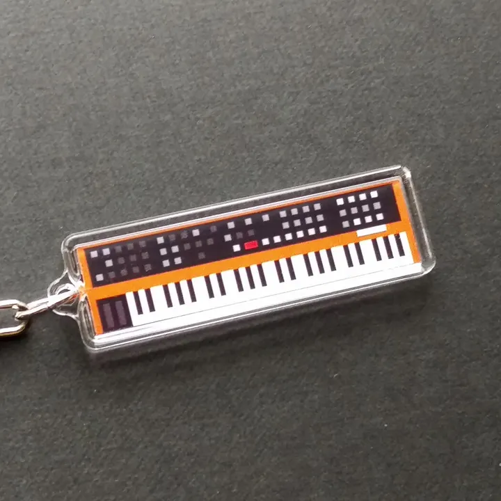シンセサイザーをモチーフにしたアクリルキーホルダーです。 ドットを使いアイコン風カッコかわいいキーホルダーに仕上げました。 クリアで上質なアクリルにデザインシートを埋め込んでいます。 表面がシンセアイコン、裏面がLCDキャラクタ液晶デザインとなっています。 お気に入りのバッグやレッスンバッグ、機材ケースにつけてもいいかもしれません。 シンセ好きが反応するかもしれませんね♪ <商品内容> クラシックアナログシンセをイメージ。 丸いツマミも四角いドットになってしまいましたが 結構ツマミに見えるもんですね。 シンセキーホルダー 02:ANALOG SYNTHESIZER