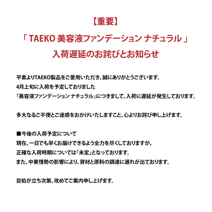 【重要】「TAEKO 美容液ファンデーション ナチュラル」入荷遅延のお詫びとお知らせ 平素よりTAEKO製品をご愛用いただき、誠にありがとうございます。 4月上旬に入荷を予定しておりました「美容液ファンデーション ナチュラル」につきまして、 入荷に遅延が発生しております。 多大なるご不便とご迷惑をおかけいたしますこと、心よりお詫び申し上げます。 ■今後の入荷予定について 現在、一日でも早くお届けできるよう全力を尽くしておりますが、正確な入荷時期については「未定」となっております。 また、中東情勢の影響により、資材と原料の調達に遅れが出ております。 目処が立ち次第、改めてご案内申し上げます。 -------- 〇製品特徴 SPF16・PA++ 石けんだけで落せる 潤い美肌ファンデーション 〇特化成分 アルカリゲネス産生多糖体 グリチルレチン酸ステアリル 石油系合成界面活性剤・防腐剤・鉱物油・香料・着色料・エタノール・動物油・ エデト酸塩は使用しておりません。 ※ナチュラルは4月初旬入荷予定です。