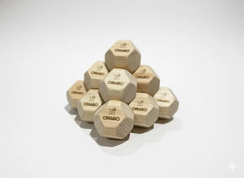 18面体脳トレ積み木OHAKOは【2025年大阪製ブランド】認定商品、子どもたちに日本の木でワクワクしてほしいと思い、大工さんが考えた積み木です。