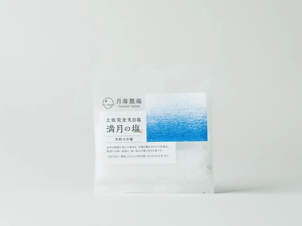 ■高知県の恵み、満月の塩 高知県の美しい海で作られた、土佐完全天日塩・満月の塩。 満月の大潮の時期に汲み上げた海水を、太陽と風、自然の力で結晶化させた特別なお塩です。 職人の手でじっくりと塩を結晶化させ、一粒一粒に海のミネラルが閉じ込められています。 カリッと食感の希少な大粒のお塩をお楽しみください。 ■まろやかで旨味のある味わい 満月の塩は、力強い塩味と旨みがあり、素材の味を引き立てる力があります。大粒は刺身やソテーしたお肉やお魚にふりかけてアクセントに。普段の食事に、ちょっとした贅沢をプラスしたい方におすすめです。 ■幅広い料理に活躍します! サラダや刺身、炭火焼き、おにぎりやスープに至るまで、様々な料理に使えます。素材の味を引き立てるので、ぱらりとふりかけるだけで美味しい一品が出来上がります。持ち歩いて、お茶や水にひと振りすることで、体調管理の一助にもなります。 ● 満月の時期に汲み上げた海水を使用 ● 黒潮の力強い塩味と、深い旨みが特徴 ● 味の濃いお料理と相性ぴったり ● 小粒は、野菜の天ぷらや鶏の唐揚げ、  白身魚のグリルなど万能 ● 大粒は、赤身の肉や魚、スープにおすすめ 【品 名】土佐完全天日塩 満月の塩 大粒 【原材料】海水(高知県幡多郡黒潮町) 【内容量】30g 【製造者】月海製塩(つきみせいえん) 【保存方法】直射日光・高温多湿を避け、常温で保存してください。 満月の塩 成分表示(100g当たり) エネルギー:0kcal たんぱく質:0g 脂質:0g 炭水化物:0g 食塩相当量:89.4g カルシウム:590mg マグネシウム:270mg カリウム:110mg