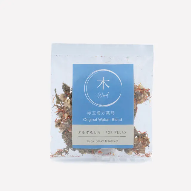 Original Wakan Blend 五行タイプ別「温活よもぎ蒸し」 IERU Herbal Steam treatment ■東洋医学の自然哲学「五行論」は、自然界のすべてを木・火・土・金・水の5つの要素に分類し、それらが互いに影響を与え合いながら変化し、循環して成り立つという考え方です。赤玉漢方薬局では、この五行論を取り入れ、現代女性の体質や不調に寄り添う「よもぎ蒸し」をご提案。五行タイプに基づいた5種類の和漢ブレンドを、体調やお悩みに合わせてお選びいただけます。漢方専門薬局ならではの視点で選んだ和漢植物を用い、からだの内側から巡りを整えます。5種類のブレンドが、あなた本来の健やかさと美しさを穏やかに引き出します。 ■5つの特徴 ①70年の歴史を持つ漢方専門薬局がブレンドした“本格よもぎ蒸し” 赤玉漢方薬局では、国内大手製薬会社から直接仕入れた高品質な和漢植物を、薬剤師の管理のもと自社で丁寧に調合・製造しています。農薬検査や重金属・微生物検査をし、局方基準をクリア。どなたにも安心してご使用いただける品質です。よもぎをはじめ、蒸気でからだに取り入れることを前提に、飲用できるほど安全な品質にこだわった温活ケアをご提供しています。 ②五行論に基づいた、 目的別の和漢ブレンド 漢方の自然哲学である「五行論」に基づき、体質や状態に応じた5種類の和漢ブレンドをご用意。 冷え、ダイエット、不妊や更年期障害などの婦人科系のお悩み、 肌トラブル、ストレス、疲労感、自律神経の乱れによるパニック障害など…、さまざまな目的に応じて、最適な和漢植物を選び配合。 ③香りと効能のバランスを重視したブレンド 蒸気とともに立ちのぼる和漢植物のやさしい香りが、心身に深いリラックスをもたらし、自律神経にも穏やかに働きかけます。 使用する生薬はすべて、乾燥素材のまま刻んだり、砕いたりといった丁寧な加工を施し、 少しでも植物のエキスが熱水にしっかりと流出するよう、自然の恵みを最大限に引き出しています。 「ただ混ぜるだけ」では実現できない、香りと効能のバランスを大切にした、 からだとこころの両面へのやさしい温活ケアです。 ④「女性の宝」トウキ × よもぎのWアプローチ 女性のからだを整える代表的な生薬「トウキ」を配合。 使用しているのは、香りと品質に優れた奈良県産「大和当帰(ヤマトトウキ)」です。 この和漢ハーブ蒸しでは、よもぎをベースに、トウキ、桂皮(けいひ)、生姜など、古くから女性の養生に用いられてきた和漢植物を、赤玉独自のバランスで丁寧にブレンド。 中でも「大和当帰(ヤマトトウキ)」は、ふんわりと広がる温かな蒸気が全身をやさしく包み込み、香りとともに巡りを促します。 「温めて巡らせる」力を持つよもぎとの相乗効果により、外側と内側の両面からのWケアを実現。 肌と心にしっとりとした潤いと温もりを届ける、本格的な温活ケアです。 ⑤肌・からだ・心を満たす、日常に取り入れやすい和漢温活ケア トウキやよもぎなど、女性のからだを内側から支える和漢植物をバランスよく配合し、 冷えや巡りの滞りをやさしく整えます。 トウキは肌のうるおいを守り、キメやハリを整える働きが期待でき、 巡りを高めることで、美容と健康をトータルにサポートします。 香りはやわらかく強すぎないため、よもぎ蒸しが初めての方や香りに敏感な方にも心地よく。 “本格的でありながら、やさしく続けられる” 忙しい毎日の中で、ふっと力を抜けるひとときを届ける和漢の温活ケアです。 ■WOOD - 木 - FOR RELAX 深呼吸するように、心とからだをゆるめて。 ストレスからくる不調、眼精疲労や肩こりが気になる方に ストレスや緊張をふわっとほどくように、心とからだの巡りを整える和漢ブレンド「FOR Relax」。眼精疲労、肩こり、イライラ、気分の浮き沈みに悩む方におすすめ。穏やかな香りと植物の力で、深いリラックスと癒しの時間を届けます。忙しい毎日にひと息つける、心のゆとりを育むブレンドです。 ■こんな方にオススメ ・ストレスで心身がこわばる ・眼精疲労や肩こりがつらい ・イライラしやすい ・気分が不安定になりやすい ・身体に力が入りやすい ・深くリラックスしたい ■WOOD-木-の原材料 身体を温め巡りを整えるヨモギと、血の巡りを整え女性のバランスを整えるトウキ葉に、こわばりをゆるめるクズやサイコを配合。シャクヤクが婦人科系の不調や筋肉のこわばりに働きかけ、ウコンはストレスによるイライラに、チンピが気の巡りを助け心身を整えます。