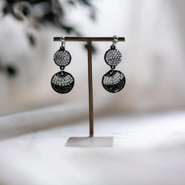 このアクセサリーは、サイズの違う丸がつながったモチーフが特徴です。 全体に散りばめられたビーズと中心のスパンコールが揺れるたびにキラキラと輝き、華やかな印象を与えます。 色展開は、どんな服装にも合わせやすいブラックと上品なホワイトの3色をご用意しており、様々なシーンに合わせてお楽しみいただけます。特別な日やカジュアルな日常使いにも最適なアイテムです。 曲ビーズを1粒1粒丁寧に縫い留めているため、万が一、ビーズがほつれてしまっても他のビーズが崩れることはありません。この技術があるため、デザインの美しさと耐久性を両立させ、長く愛用いただける品質を実現しています。
