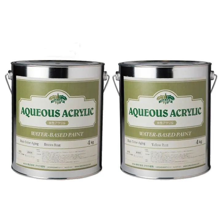 当店オリジナルのサビの色を表現した塗料「Rust Collar Aging(錆エイジング)」です。 塗装でいうエイジングとは、新しいものをわざと古ぼけたように塗装する技術のことです。 そのエイジングで一番難しいとされるところは、それらしく見せるための色合わせです。 その難しいところを調色の技術で作りました。 色の中に金属の錆らしさを感じさせる メタリックの輝きがあり、より本物の錆にみせることができます。 こちらの「錆エイジング」はBrown Rust(ブラウンラスト)とYellowRust(イエローラスト)の2色で仕上げる塗料です。 木部、外壁、内壁、建具などに塗装できます。 水性アクリル塗料になります。 【用途】 木工作品、屋内外のモルタル壁、厨房、天井等 【特徴】 ・内外装建築用として使われます。 ・水で薄めて使えます。 ・乾燥後は水にも強く、溶けません。 【使用方法】 ・水で薄めて使用してください。 ・2色を交互に塗り重ねることにより、深みのある錆を表現することができます。 【乾燥時間】 ・指触乾燥時間(触って指につかなくなるまでの時間):30分 ・硬化時間:2時間 【塗装性状】 ・耐水性 96時間以上 変化なし ・耐アルカリ性 48時間以上 変化なし ・耐洗浄性 400回以上 ・促進耐候性 500時間以上 【塗装上の注意】 ・気温5℃以下での使用は避けてください。 ・塗装用具は使用後直ちに水で洗って下さい。一旦乾くと、再び水に溶けません。 【参考小売価格】 ・4kg set 20000円 【セット内容】 ・ブラウンラスト 4kg×1 ・イエローラスト 4kg×1
