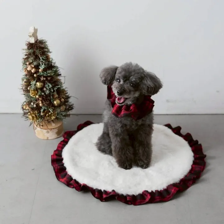 人気のフリルカフェマットに、これからのホリデーシーズンにぴったりな フワフワのファー×華やかなチェックフリルバージョンが登場! お出かけの時にサッとマットを取り出して使えるので、とっても重宝するアイテムです♪ 本体には柔らかく毛足の長い肌触りの良いフェイクファーをふんだんに使い、 思わずウトウト・・・まるで毛布のような暖かさ。 フリル部分にはホリデーシーズンにぴったりな華やかなチェック生地をふんだんに使用。 フリルと同素材の巾着付きなので、出し入れも、持ち運びもらくちん♪ 巾着はカラビナ付きでバッグに装着して持ち運ぶことができるので いろいろ荷物が多くなる愛犬、愛猫とのお出掛けも安心です。 【POINT!】 ①お揃いの巾着ポーチ付き! 巾着に入れて持ち運びでき、カラビナ付きなのでバッグにつけることも♪ ②裏は滑り止め加工 マットの裏は滑り止め加工の生地を使用しているので、カフェの椅子などでも滑らず安心! (合成皮革のソファーなどの場合、摩擦により滑り止め部分が張り付く恐れがございますのでお気を付けください)