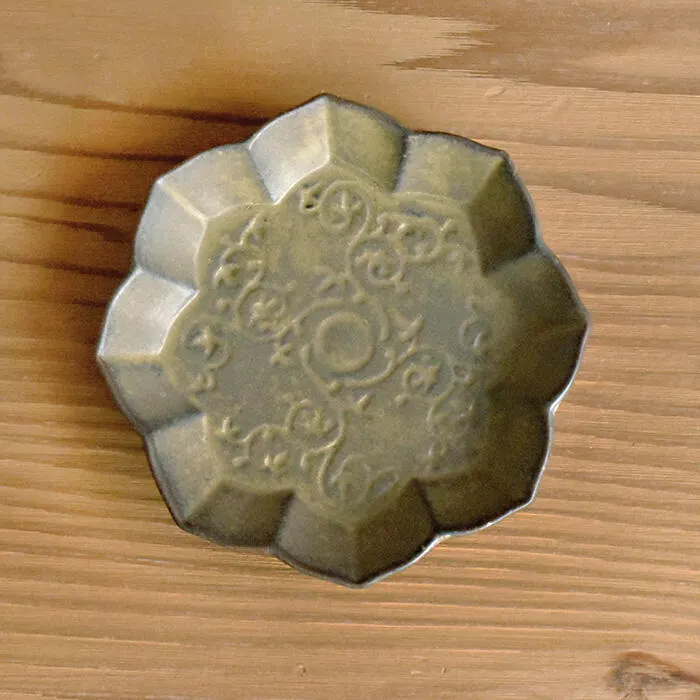 楽 線刻豆皿 八稜鏡 グレーマット 15361