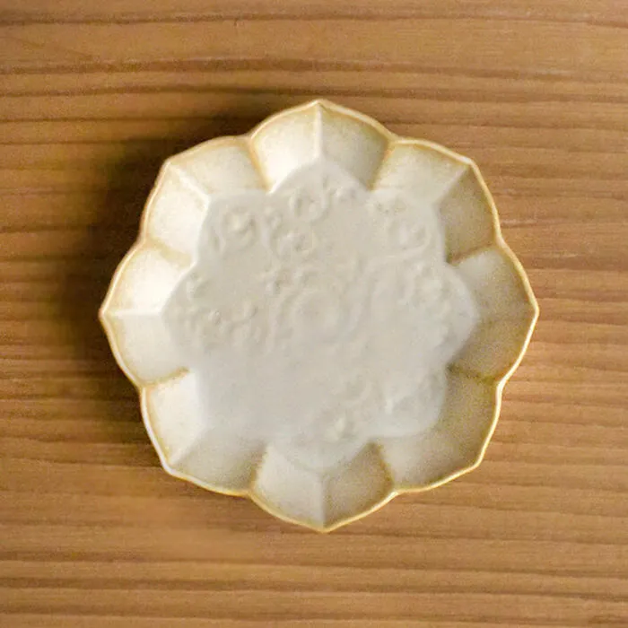 楽 線刻豆皿 八稜鏡 ベージュマット 15362