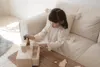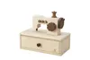 大人と子どもの願いを融合!遊べる・飾れるミシンのおもちゃ! お家に置くおもちゃも色や見た目にこだわりたい人に向けたレトロなミシンそっくりなおもちゃです。 手芸好きなスタッフが見た目、テーマ、機能にこだわって開発しました。 ミシン右側のレバーを回すとオルゴール(崖の上のポニョ)が流れます。 ミシンのおもちゃらしく、糸を通した針で縫うような動作で遊べるキットが付いていて、裁縫箱さながらの小物入れも付いています。 セット内容:本体、ボビン/1個 木型/8枚(長方形:2枚、正方形:1枚、三角形:3枚、星:1枚、花:1枚) 付属品:ヒモ/5本(赤、青、黄、緑、茶、各1本) プレイガイドブック/1冊