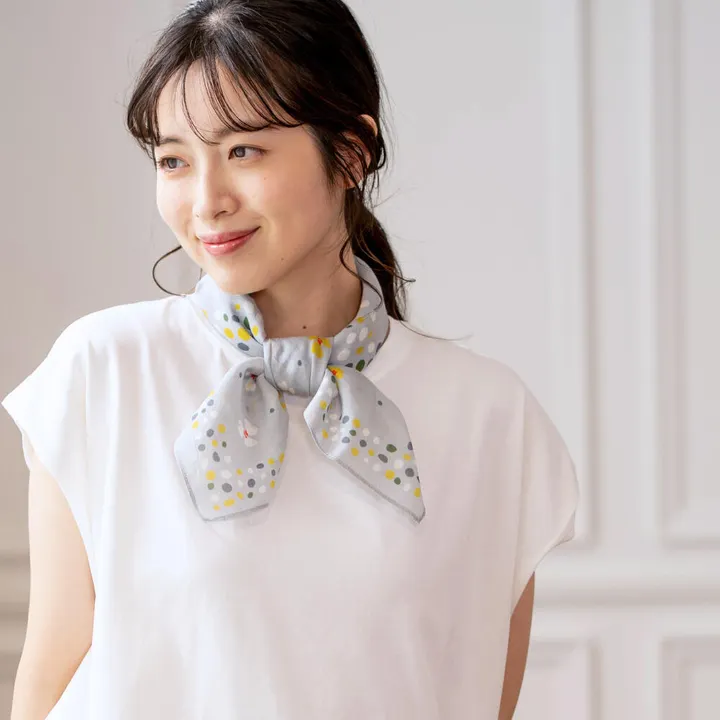 シックな色合いに、可憐な花モチーフと、ランダムドットを組み合わせた大人のためのスカーフ。 シンプルな装いにプラスするだけで、ぐっと華やかな印象になります。 首元に巻いてアクセントにするのはもちろん、日よけや冷え対策にも。カジュアルにもきれいめにも合わせやすいデザインで、いつもの着こなしをクラスアップしてくれるアイテムです。 コットンシルク素材を使用しているため、肌触りの良さと高級感のある質感を兼ね備えています。 【ファッション雑貨】【小物】【UV/紫外線対策】【冷房対策】【母の日】
