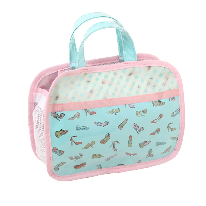 ビーチリゾートから国内の温泉旅行まで大活躍の予感! サイドと底面はメッシュ素材、持ち手部分までビニールコーティングされたこだわりのアイテムです。 内側のメッシュポケットはファスナー付きだからコインや携帯電話など大切な持ちものを入れるのにピッタリ。 靴が散りばめられた総柄デザインは、それぞれ柄やシェイプが違うからお気に入りを探すのも楽しい。