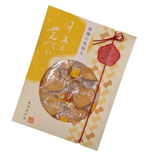 ハート型のかわいいキャラメル味のせんべいです。