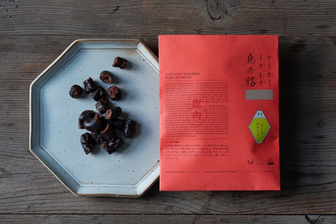鹿肉本来の旨味を引き出す「燻香シリーズ」。2歳までの鹿を過度なストレスをかけずに捕獲、2時間以内に処理、加工をすることで、ジビエ特有の臭みは一切感じられない高品質な鹿肉です。燻煙に使用するチップには、桜、すもも、りんご、松などオリジナルのブレンドチップを使用し、バランスの良い「優しい香り」に仕上げています。 燻香ひと口カルパスは、鹿肉を天然羊腸に詰め、深みのある味を引き出す為に丸2日間、燻煙の中に吊るしています。