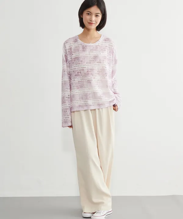特徴 ソフトな麻混ラッセル素材で仕立てた、ゆったりシルエットの太ボーダープルオーバー。存在感のある柄とやわらかな着心地が魅力で、1枚でコーデが完成します。淡い色合いとアイレット風の編地のシアー感軽やかな抜け感を演出。 素材感 ふんわり柔らかな風合いのソフトラッセル素材を使用。麻混で通気性が良く、肌離れも良く、長時間着ても快適。程よい厚みでオールシーズンに最適です。 スタイリング提案 デニムでカジュアル王道コーデ ロングスカートで大人フェミニン ワイドパンツでリラックスムード おすすめシーン 休日のお出かけ、カフェタイム、旅行、ちょっとしたお散歩など、デイリーに大活躍。 単位(cm)モデル身長167cm サイズ: FREE  着丈 53 バスト 130 裄丈 77 素材:ポリエステル95% 麻5% 中国製 透け感:あり 生地の厚さ:普通 光沢感:なし 裏地:なし 家庭洗濯:可能 【注意点】 ※撮影商品はサンプルの為、実際の仕様と異なる場合がございます。 ※画像の商品は光の照射や角度、お使いのモニター環境により、実物と色味が異なる場合がございます。スタジオ物撮りの画像が実物の色味に一番近くなっております。 ※予約商品の場合、お届け予定はあくまでも目安となります。 生産の都合上、お届け時期がずれる場合がございますので、あらかじめご了承ください。 ※表記サイズは商品の実寸です。 ※布製品の特性上、サイズ表の実寸法は多少の誤差が生じる場合がございますので、予めご了承ください。