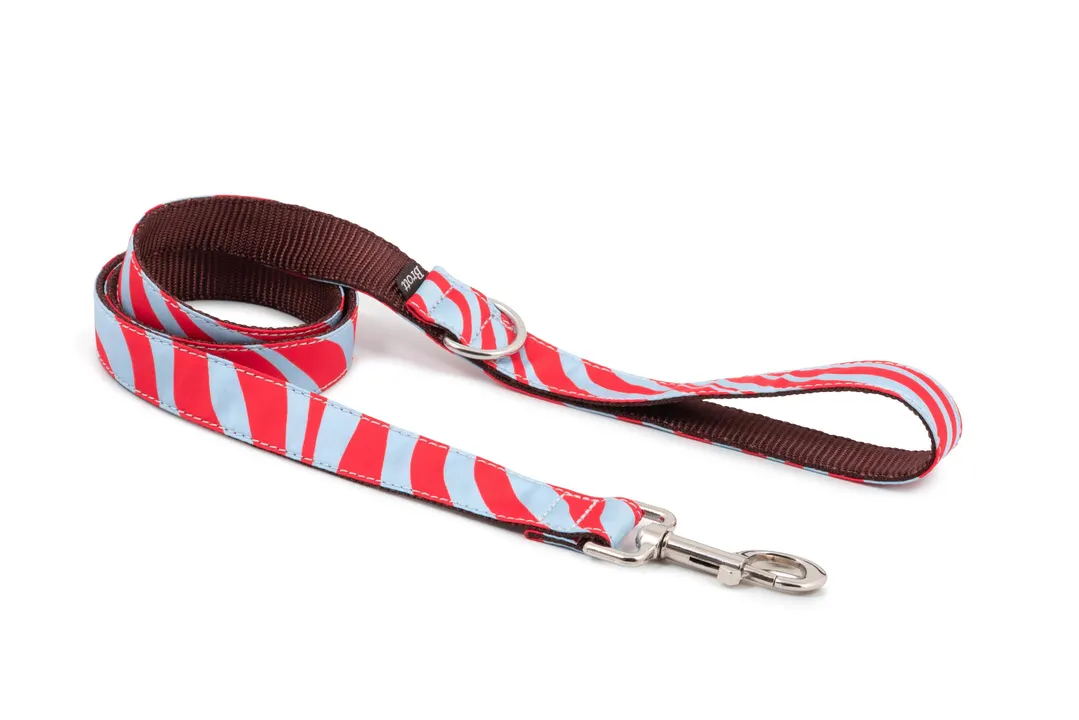 2025新色 ? 情熱的なレッドとライトブルーが織りなす、視線を奪うサイケデリックなカラーリング。リズムを刻むような曲線とコントラストが魅力のプリントは、見る人の心を惹きつけます。 この春夏のグラフィックトレンドからインスパイアされ、工房でリサイクル素材を用いて一点ずつハンドメイド。 「ストリートスタイルの主役は犬だってなれる」——そんな遊び心とエネルギーを詰め込んだリードです。 ?
