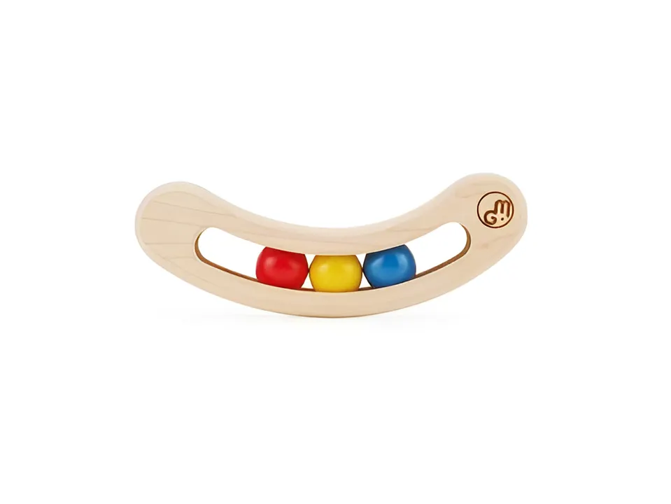 FAVAはイタリア語で「豆」の意味。 房に豆が3個入っている、ガラガラです。握ることや手元に置いて遊ぶことで豆の動きや音を楽しめます。 「FAVA」ファーヴァは赤ちゃんの手元に置いて、握ったり、振ったり、机や床で揺らしたり、回したりなど、遊びの中で指先を使って豆の動きをよく見ることで、良い刺激が脳を育ててくれます。