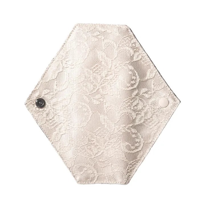 私らしさにこだわりたいリュクスな女性のためのデリケートゾーンランジェリー。 『サニタリーからランジェリーへと世界を変える』 これまで “消耗品” として扱われてきたパンティライナーを、「ランジェリー」という新しい価値 として提案します。 こだわりぬいたレースと、ショーツにすっとなじむシンプルなフォルム。 吸水体が縫い込まれたふんわり仕様で、温かさを感じられるのが特徴です。 Princessタイプは、防水機能はありませんが、やさしくあたため、守ってくれるような存在感のあるライナーです。 <素材>(4層構造) コットンシルク(群馬県産シルク使用・ウォッシャブル加工済み) 吸水体(コットンネル) サテン レース ※防水ではありません <商品サイズ> H=約15cm W=約15cm(使用時:約15cm×約5cm) <商品の色> 肌面:ブラック(コットンシルク) 外面:ベージュレース・ベージュサテン ※撮影環境により、実際のカラーと多少異なる場合がございます。 【ご使用方法】 ショーツのクロッチ部分に置き、レース面がショーツ側に合わさるようにセットします。 スナップボタンのついているサイドをショーツの外側へと折り返し、合わせて留めてください。 【お手入れ方法】 ・ご家庭の洗濯機で洗っていただけます。 ・乾燥機のご使用は避け、陰干しに。 ・経血や気になる汚れがついてしまった場合は、30度以下のぬるま湯か水につけ置きし、手洗いなどで落としてから、洗濯機へ。