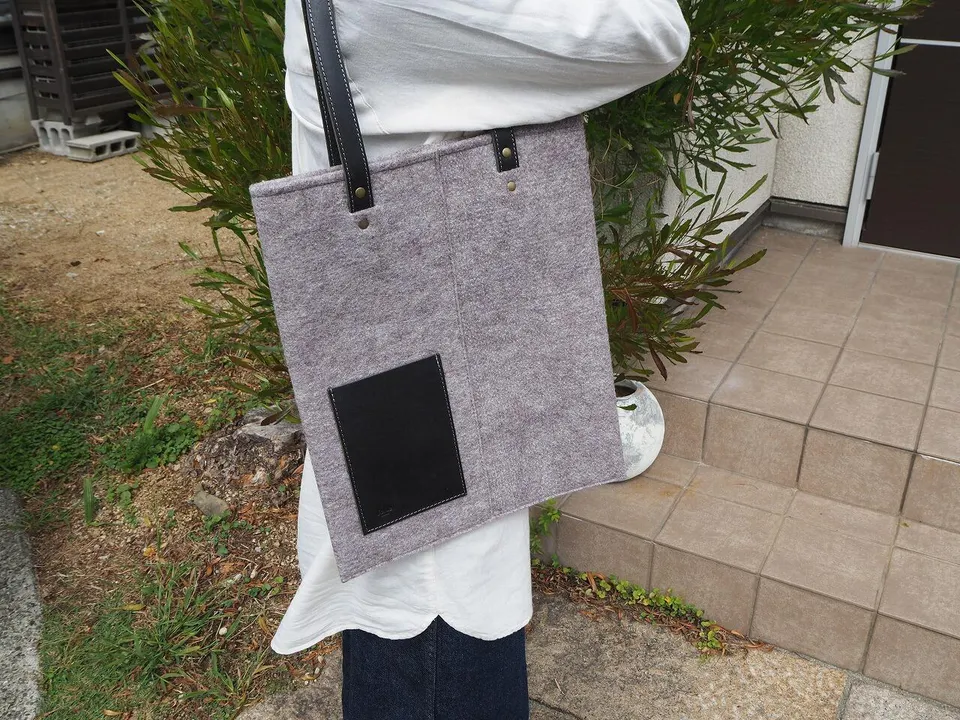 [recycle Felt = 再生フェルト] × [genuine Leather = 国産本革] ペットボトルを回収してつくられた独自開発の再生フェルト、 つかいこむほどに経年変化する国産の本ヌメ革、 普段は交わりあうことのないふたつの“環境素材”。 味わい、温かみ、軽さ、丈夫さ、弾力性、耐久性、防虫性、形状安定性… お互いの素材の良さを引き出し、上手く調和させることで、オン・オフを問わず、 愛着をもって長く使っていただける新しいスタイルのアップサイクルプロダクツ。 FelLe®(フェルレ)は、そんな想いを込めた新しいエコプロダクトブランドです。 ――― 商品説明 ――― A4サイズ収納の実用性のある手軽な使い勝手のマチなしトートバッグ ・A4サイズのファイルが縦に入る大きさのオンオフ使い可能なマチなしトートバッグ ・厚手の再生フェルト素材で、中身を守る機能性に加え、大きさの割に軽量です。 ・外側のポケットは、スマホや電子カードの収納に便利 ・内側には長財布が縦に入る大きめサイズのファスナー付きポケットも配置しています。 ・持ち手とポケットには本革を使用し、経年変化を味わえます。 ・フェルト生地は、あえてムラ感を出したスモーキーカラーとなる特殊製造オリジナル生地。 素材: 再生ポリエステル 本革 サイズ: 約W330×H280×D25㎜(持ち手:約530㎜) 重さ: 約250kg カラー展開: 7色 ――― お買い上げ前にお読みください ――― ・本革を使用している部分には、本革特有の多少の表情のムラや傷、手触りの違い等がありますが、天然本革の一般的な特長であり損傷ではありません。 また、日光や外気や使用時の手触り等により、経年変化を起こし、色が濃くなることがあります。 ・生地のフェルトの素材の性質上、摩擦により毛玉ができることがありますが、ハサミなどでカットしてください。