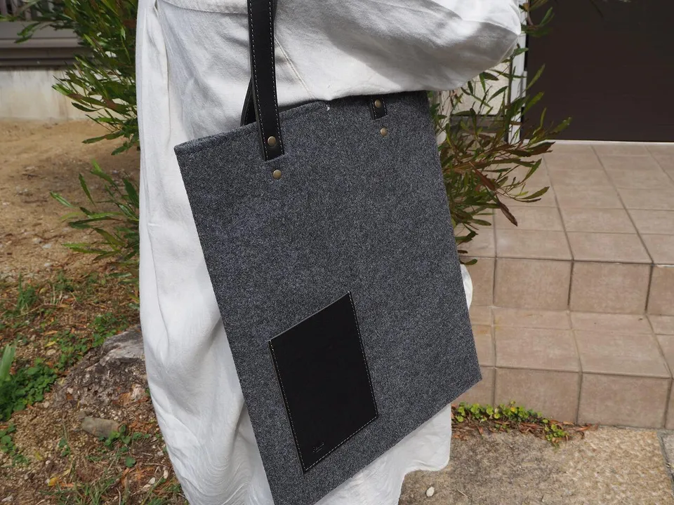 [recycle Felt = 再生フェルト] × [genuine Leather = 国産本革] ペットボトルを回収してつくられた独自開発の再生フェルト、 つかいこむほどに経年変化する国産の本ヌメ革、 普段は交わりあうことのないふたつの“環境素材”。 味わい、温かみ、軽さ、丈夫さ、弾力性、耐久性、防虫性、形状安定性… お互いの素材の良さを引き出し、上手く調和させることで、オン・オフを問わず、 愛着をもって長く使っていただける新しいスタイルのアップサイクルプロダクツ。 FelLe®(フェルレ)は、そんな想いを込めた新しいエコプロダクトブランドです。 ――― 商品説明 ――― A4サイズ収納の実用性のある手軽な使い勝手のマチなしトートバッグ ・A4サイズのファイルが縦に入る大きさのオンオフ使い可能なマチなしトートバッグ ・厚手の再生フェルト素材で、中身を守る機能性に加え、大きさの割に軽量です。 ・外側のポケットは、スマホや電子カードの収納に便利 ・内側には長財布が縦に入る大きめサイズのファスナー付きポケットも配置しています。 ・持ち手とポケットには本革を使用し、経年変化を味わえます。 ・フェルト生地は、あえてムラ感を出したスモーキーカラーとなる特殊製造オリジナル生地。 素材: 再生ポリエステル 本革 サイズ: 約W330×H280×D25㎜(持ち手:約530㎜) 重さ: 約250kg カラー展開: 7色 ――― お買い上げ前にお読みください ――― ・本革を使用している部分には、本革特有の多少の表情のムラや傷、手触りの違い等がありますが、天然本革の一般的な特長であり損傷ではありません。 また、日光や外気や使用時の手触り等により、経年変化を起こし、色が濃くなることがあります。 ・生地のフェルトの素材の性質上、摩擦により毛玉ができることがありますが、ハサミなどでカットしてください。