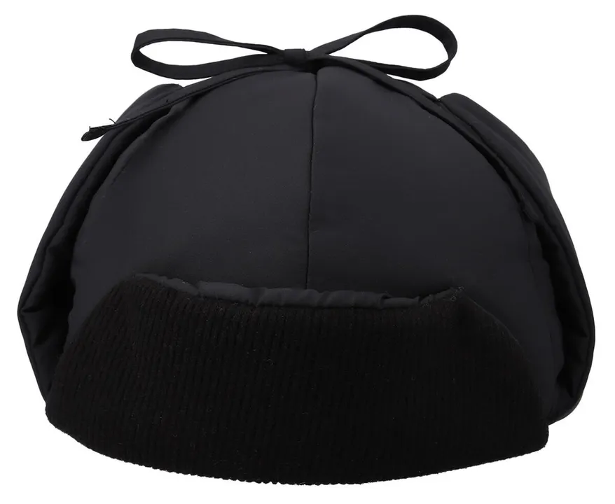 ダウンジャケットをイメージしたフライトキャップ。前立て部分だけはリブ編みのニット。耳当てのリボンは細くガーリーに。