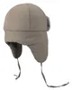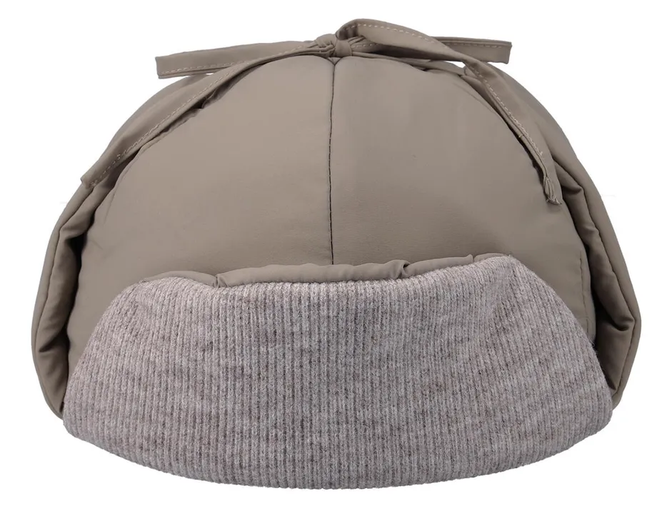 ダウンジャケットをイメージしたフライトキャップ。前立て部分だけはリブ編みのニット。耳当てのリボンは細くガーリーに。