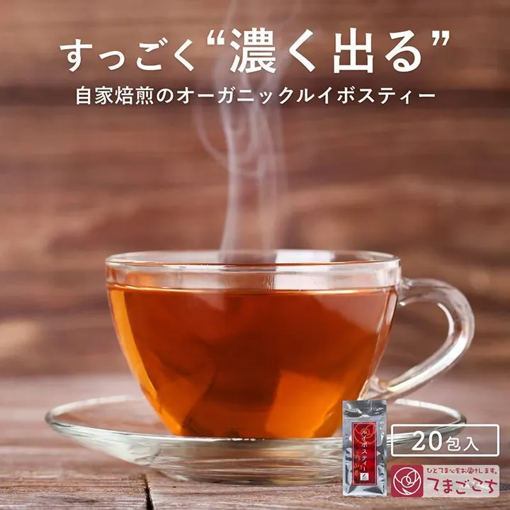 すっごく“濃く出る”自家焙煎ルイボスティー ノンカフェインで妊婦さんからお子様、ご年配の方まで安心してお飲みいただけるルイボスティー。 南アフリカ喜望峰のROOIBOS SUPERIORを自家焙煎して販売。てまごこちの自家焙煎ルイボスティーは味が濃く出るため、より味わい深いルイボスティーに仕上がっています。ギフトにもおすすめです。 「ルイボス」とは南アフリカ共和国のセダルバーグ山脈に自生するマメ科の低木のこと。この木から作られるお茶を「ルイボスティー」と呼びます。また「ルイボス」とは現地の言葉で「赤い茂み」を意味します。 ルイボスティーは日本茶、紅茶、中国茶等と全く異なり、松の葉のような針状の葉の部分をお茶にします。 古くより南アフリカの先住民の日常的な飲み物として親しまれ「奇跡のお茶」「不老長寿のお茶」として日々の健康の為に飲まれ続けてきました。 ルイボスティーはノンカフェイン(カフェインフリー)の飲み物。そのため、妊婦さんや授乳中のお母さん、小さなお子様からご年配の方まで安心してお飲みいただけます。ほんのりと甘い香りと爽やかな味わいは就寝前の飲み物にも最適です。 ノンカロリーで癖がなく飲みやすい味なので、ダイエット中の方にもおすすめです。ミネラルが豊富なため、暑い季節の熱中症対策にも最適です。 当店では南アフリカルイボス茶葉トップメーカー「ルイボスリミテッド社」の「ルイボス スペーリアオーガニック」の茶葉を使用しています。中で茶葉がジャンピングしやすいよう立体型のテトラパックタイプのティーバッグを使用しています。(写真はイメージです) お湯(1.8リットル)にティーバッグ1包を入れて5分沸騰させてください。ホットでもアイスでもおいしくお飲みいただけます。 ・毎日のお茶に ・ノンカフェインの飲み物が飲みたい時に ・妊婦さんに ・授乳中のお母さんに ・お子様に ・ご年配の方に ・家族みんなでお茶を飲みたい時に ・運動中に ・仕事中に ・カロリーが気になる時に ・カフェインが気になる時に 元々ルイボスティーが好きだったのですが、こちらのルイボスティーはとにかく濃く出るので手放せなくなりました! 妊娠・出産をきっかけに家族みんなで飲めるお茶を探していた時に見つけました。濃く出るので煮出す時間も短縮できて便利です。