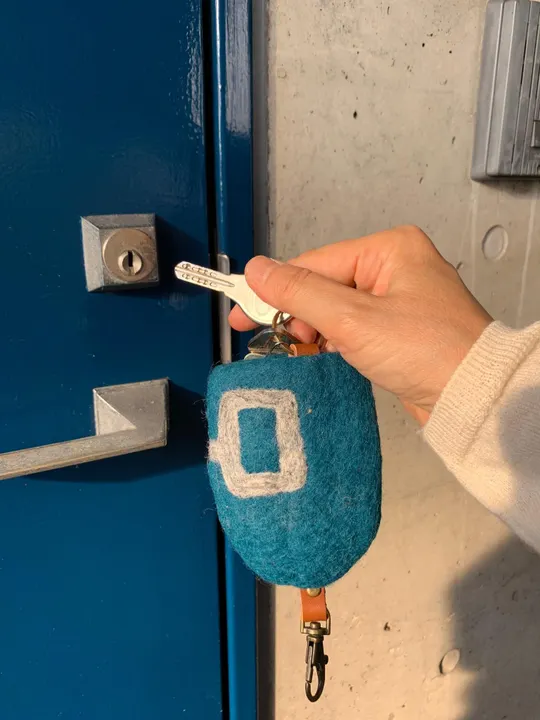 北欧風のシンプルな鍵のデザインのキーケース。表裏で鍵のシルエットがつながるデザイン。革のひもを引っ張ると鍵がフェルトの中に収まる仕組みになっています。フェルトなので、バックの中でも鍵がガチャガチャしません。 ひとつひとつ手で作られたかわいらしい感じがバッグから鍵を出すときちょっと嬉しい。 フェルトの制作はすべて手仕事で、羊毛にアルカリ性である石鹸水を含ませてもんだり巻いて転がしたりして縮絨(しゅくじゅう)させ成形します。とても手間のかかる作業です。鍵のシルエット部分は針で何度も刺し、フェルト地にからませていくニードルポイント手法で制作します。ひとつひとつ、少し違う手作り感に愛着がわいてきます。ちょっとしたプレゼントにもおすすめです。 黄色・ターコイズ・ピンクの3色です。