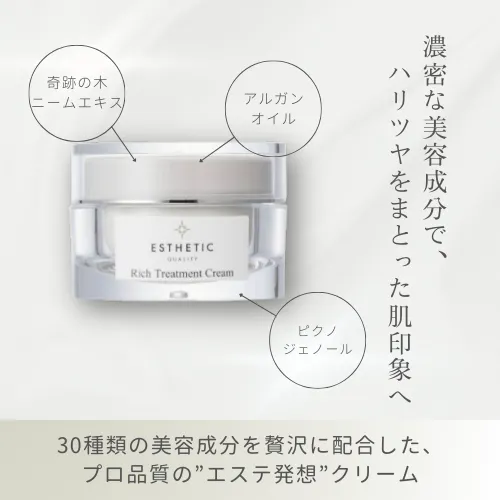 ╲手にすいつくような潤いとハリ艶/ 毎日のスキンケアに、肌が喜ぶ「特別感」を。 ◆サロン内スキンケア物販No.1 ◆お客様/スタッフのリピート購入多数 施術の効果を引き上げ、肌を土台から整えるために開発された 業務用&店販用オーガニック×エイジングケアクリームです。 フェイシャルエステで使用できるクオリティでありながら、 毎日のホームケアにも心地よくなじむ処方にこだわりました。 ❁ 濃密な潤いで、長時間しっとり 30種類の美容成分を贅沢に配合。 乾燥しがちな肌を包み込み、 手に吸いつくような潤いが続く肌へ導きます。 ❁ うるおいで、毛穴や乾燥による小じわが目立ちにくいふっくらハリ感のある肌印象へ ピクノジェノール・アルガンオイル配合。 年齢とともに失われがちなハリ・弾力をサポートし、 なめらかで引き締まった印象に。 ❁ ツヤ感と透明感あふれる澄んだ印象の肌へ 奇跡の木と呼ばれる**「ニーム」抽出エキス**と 植物プラセンタを配合。 くすみがちな肌を整え、 内側から輝くような明るい印象を引き出します。 【肌にやさしい8つのフリー処方】 アルコールフリー/パラペンフリー/鉱物油フリー 石油系合成界面活性剤フリー/着色料フリー 香料フリー/シリコンフリー/紫外線吸収剤フリー 敏感に傾きやすい大人肌にも、毎日安心してお使いいただけます。
