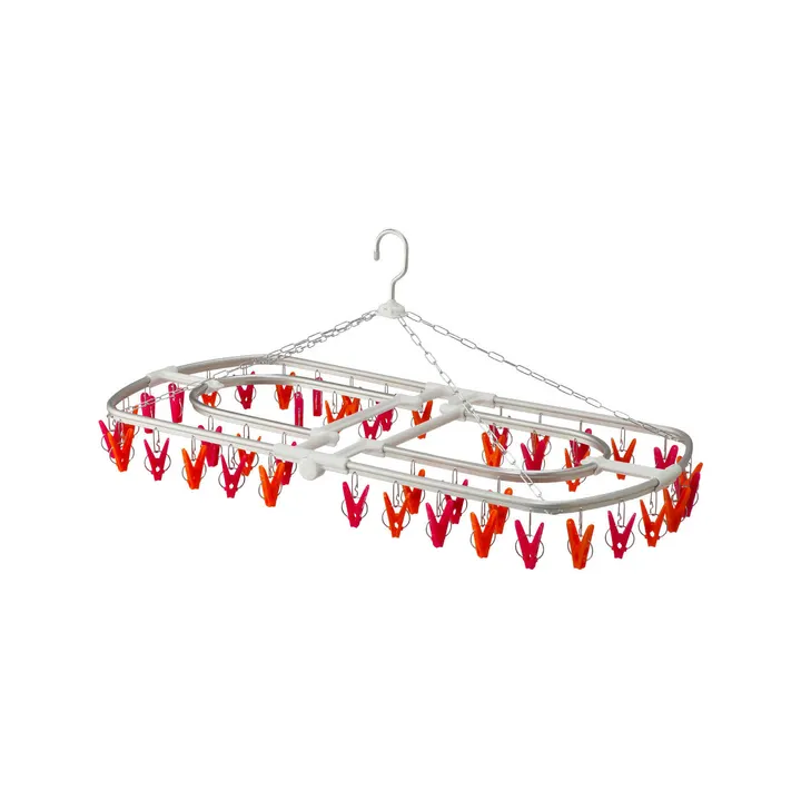 ●山折り式●軽くて丈夫、欲しい機能を満たした適度なサイズの44ピンチ●収納時にフックが曲げられる便利な回転アルミフック●二重に配置されたピンチで、隠し干しOK●ねじれやたわみに強いリブ付きのアルミフレーム、ピンチ取付け部も金属製(アルミ製リブ+金属製リング)で頑丈●取り替え用ピンチをワンタッチで取り付けできる(工業所有権取得済)を採用