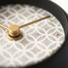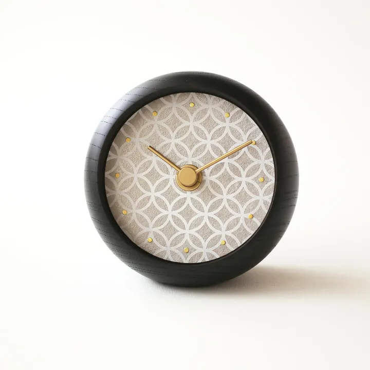 円が規則正しく並んで満ちている七宝紋は、円満・吉祥を意味するおめでたい紋として古くは正倉院の宝物にも使われているものです。 プラチナの箔に極薄の和紙(土佐典具帖紙)を重ねることで、和紙の繊維の隙間からプラチナがキラキラと繊細に輝く下地を作り、その上に七宝紋に切り抜いた和紙を貼り重ねました。光の当たり方や見る角度を変えることで、下地のプラチナが柔らかく光り輝き、文様が浮かび上がります。 本体は、漆器の産地として400年以上の歴史を持つ石川県加賀山中の「ろくろ引き」という、回転する木に鉋(カンナ)を当てて形作る方法で製作しました。 素材はケヤキで、木目が美しく、なめらかでしっとりとした質感です。 文字盤は、下地に金沢市二俣町で和紙作りをされている、石川まゆみさんに漉いていただいた和紙を使用し、 その上に天然石を砕いて作られる「岩絵具」を幾重にも塗り重ねています。インデックスは金沢の金箔です。 ■木の部分の色は、プレーン・ブラウン・ブラックの三色をご用意しております。 ■裏面カバーにオリジナルの刻印を入れることができます。(有料 +880円税込) ■受注生産のため、基本的にご注文いただいてから約2週間のお時間をいただきます。ご了承ください。 【時計部分の仕様】 ・日本製・1年保証・本体のサイズ:直径10cm厚さ5.4cm・使用電池:単3形乾電池 【付属品】 ・単3乾電池1個・取扱説明書1部・牛革製裏面カバー