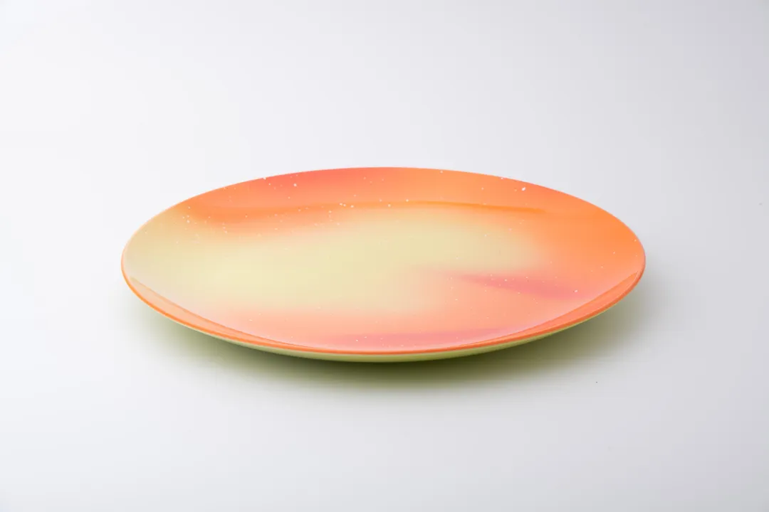 和洋問わず大きめのパーティー皿として使える盛皿(鉢)で、直接料理も盛り付けることができる表面は抗菌塗装を施し、箸などでついても傷が付きにくい。食洗器や電子レンジにも対応したプラスチック素地にウレタン塗装で職人が一つ一つ塗重ねた色彩は、山中温泉の景勝地:鶴仙渓の自然豊かな緑に佇む川床の傘をモチーフにされたデザインです。