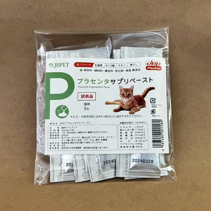愛猫の元気で健康な毎日をサポート 年齢による関節や皮膚・被毛などのトラブルから守ります \動物の医療現場で/ 10年以上の使用実績 プラセンタエキスは、関節や皮膚・被毛、眼、脳などの機能をサポートするという研究成果が多数報告されています。科学的証拠に基づいて、動物医療の現場で10年以上使用されてきました。これらの事実は、プラセンタエキスがペットの健康と福祉に有益であると考えられます。 動物病院での販売経験を活かし新たに展開する、手軽に購入・使用できる動物用サプリメントのシリーズ。 \活気・活力・食事・皮膚・被毛など健康維持をサポート/ 【商品特徴・おすすめポイント】 ・ 1食に馬プラセンタエキスを2g、鶏むね肉、チキンエキス、煮干し粉末など素材を厳選して製造 ・ プラセンタエキスは医薬品製造レベルの品質管理体制が整った工場で、安全・安心にこだわって製造 ・ 5つの不使用:食塩不使用、保存料不使用、乳化剤不使用、着色料不使用、無調味 ・ 直接でも、フードにかけても、お皿に出しても与えることができます。