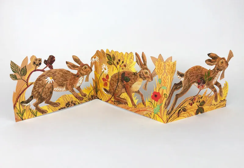 イギリスのペーパーステーショナリーカンパニー「Art Angels」の3D ダイカットカードです。 Hares collage by Mark Hearld