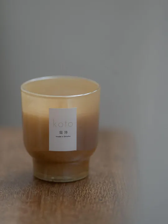 kotoの自社アトリエで作る四季巡る二十四節気のキャンドルは、厳選した原材料を配合し、ブレンドや調合、箱詰めまで一点一点職人の手によって心を込めてしつらえています。 大豆とアブラヤシの天然ワックスを独自にブレンドし、香りの拡散と持続、燃焼効率に優れたハンドメイドキャンドルをお届けします。 秋が深まり、朝霜が降りはじめる頃――霜降。 もみじや蔦は鮮やかに色づき、畑では実りの収穫が進みます。朝晩の冷え込みは日に日に増し、人々も動物たちも冬に向けた支度を整えはじめる季節です。 「霜降の香り」は、幻想的で神秘的なフレグランス。完熟した果実の豊かな甘さに、花とスパイスの気配が重なり、最後にはウッディで温もりある余韻が広がります。 まずトップノートでは、熟したプラム、チェリー、オレンジが立ち上がり、芳醇で深みのある果実感が広がります。 続くミドルノートでは、スミレとシナモンが優しく香り、花の柔らかさとスパイスの温かさが調和して、香りに奥行きを与えます。 そしてベースノートでは、シダーウッドとバニラが甘くウッディな余韻を残し、包み込むような安心感をもたらします。 天然精油には、スイートオレンジやクローブリーフの鮮やかさ、パチュリやグアイアックウッドの重厚感、シナモンバークやシトロネラ、そしてダヴァナの奥深さが重なり合い、香りに神秘性と個性を添えています。トップにはタイムをあしらい、浄化と祈りを象徴するような仕立てとしました。果実の甘さと神秘の余韻が、長い夜を幻想的に彩り、心に特別な温もりと深い安らぎを授けてくれます。 二十四節気の移ろいに寄り添うように、kotoのキャンドルはすべて厳選された原材料を用い、自社工場で一点一点、手作業で仕立てています。ワックスの配合や芯の細部に至るまで丁寧にこだわり、美しく灯りと香りを楽しんでいただけるよう心を込めています。朝の始まりから夜のひとときまで、季節の気配を感じる香りが日常に溶け込み、暮らしのリズムにそっと寄り添ってくれます。 また、キャンドルを包むグラスは、使い終えた後に湯煎して洗うことで、繰り返しお使いいただけます。kotoがご用意する別売りのティーライトキャンドルを中に入れて灯せば、二十四節気の香りをより気軽に楽しみ続けていただけます。香りと灯火を長く愛でながら、持続可能なかたちで季節の移ろいを感じていただけるように、私たちはものづくりに心を尽くしています。 【使用上の注意】 灯している時はキャンドルのそばから離れないようにしてください。一度に2時間以上の燃焼はおやめください。長時間燃焼すると、グラスが大変暑くなり破損する恐れがあります。芯が長くなったり曲がったりすると火が大きくなったり、黒い煙が出やすくなります。灯す前に芯を7mm程度にカットし、整えてください。お子様やペットの届くところでの燃焼はおやめください。サイズ選択数量 カートに追加する