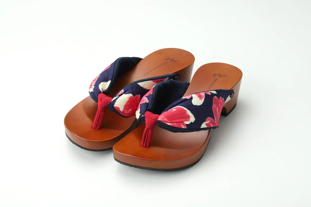 大きなピンクの花が夏らしい元気な印象を与えてくれる1足。 見た目以上に様々なスタイリングに合わせやすく、肌なじみのよい下駄です。