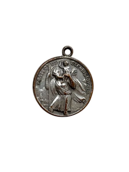 ロサンゼルスで買い付けた1点もののヴィンテージメダイ 聖クリストファー(聖クリストフォロス)とは、「キリストを背負う者」という意味を持つ、3世紀のキリスト教の伝説的な殉教者で、旅人や自動車運転手の守護聖人として知られています。力持ちで最強の王に仕えたいと願う中で、川の渡し守となり、ある嵐の夜に子どもの姿のキリスト(世界の重荷を背負っていたため非常に重かった)を背負って渡り、その正体と真の王を悟ったという伝説があります。 ※ネックレスチェーンは別のページにて販売しております  同時購入頂いた場合はネックレスにした状態で発送が可能です  ご希望の場合はメッセージください