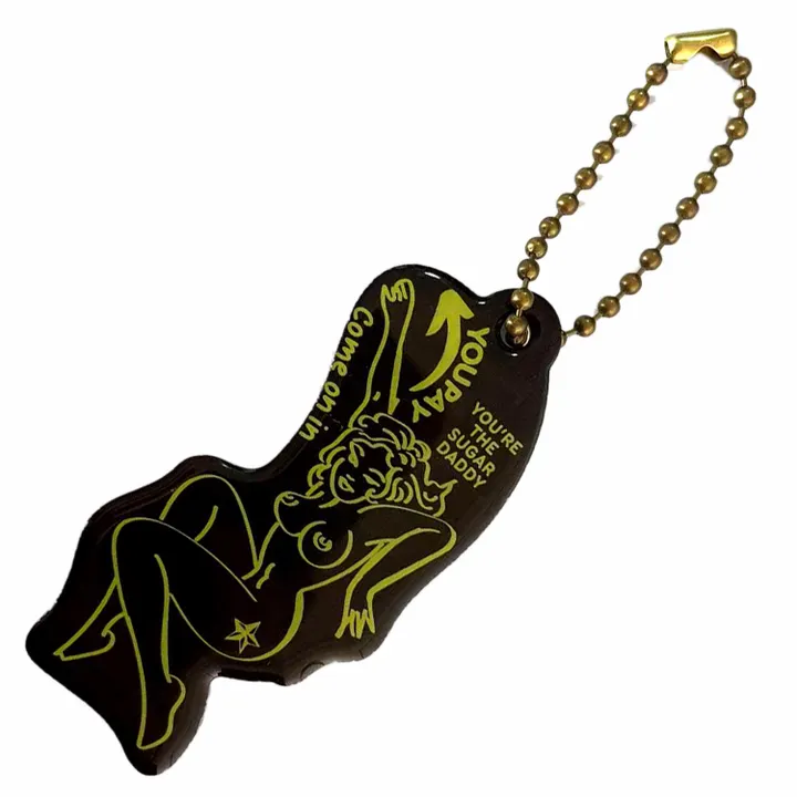 You Pay Spinner Key Holder/ユーペイスピナーキーホルダー 昔、アメリカのドリンク会社のノベルティとして配られておりました。 チェーンやキーリングを取り外してテーブルに置いてコマの様に回して指を指された人が飲み物などをおごるというゲームができ、様々なデザインが作られていました。 現在の素材(アクリル製)で復刻いたしました。