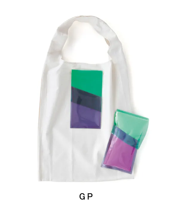 PVCポケットがポップなアクセントのバッグです。バッグを折りたたみPVCポケットに収納することで、便利に持ち運べます。旅行や買い物のお供にどうぞ。