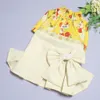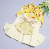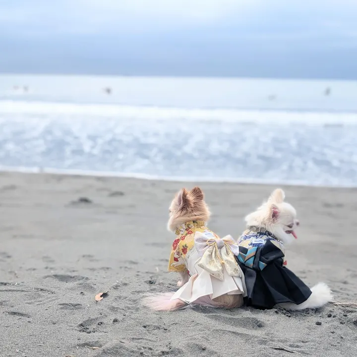 ※パーツ(紐やループエンドなど)は予告なく別の物に変わる事があります。(できるだけ似た物を選んでおりますので見た目的にはほとんど変わりません) 〜おすすめポイント〜 ●袴をイメージしたすぽっとかぶるだけのワンピースタイプのお洋服です。 前を合わせて着るタイプではないのではだける心配がありません。 着せたまま動き回れるので元気なわんこにもおすすめです。 ●首回りはゴムで調整可能。 絞り具合で好みのきつさに出来るので、わんこに合わせて調整できます。頭が入らなくて断念。。という心配はありません! ●汚れても大丈夫!洗濯機で洗えます! (リボンは取り外しできるので、外して洗濯ネットに入れれば洗濯機洗いOKです) ●袴部分はポリエステル素材です。そのためシワがつきにくいので綺麗に着ていただけます。 ★本格的なお着物に比べて、扱いやすさがなんといっても最大のおすすめポイントです! 面倒なお手入れや保管がとってもらくちんです。 お洗濯ができてシワになりづらいので、衛生面も心配無し♪ 〜サイズ選びのポイント〜 ●伸びない生地を使用しているので、胴回りは大きめで選んでください(前足を出し入れ出来るくらいのゆとり)。普段のサイズより〜+10cmくらいまでの目安でいいかと思います。※スムースコート、細い体型の犬種は+〜8cmくらいまでが良いかと思います。 前丈は短めで、前見頃のお腹の部分にはゴムが入っていますので、男の子でも問題なく着られます。 ●首のゴムは長めに残しているので、お客様自身で調整することが可能です。(緩めに結んであるのでおうちのコに合わせたあとはしっかりと結んでください。)